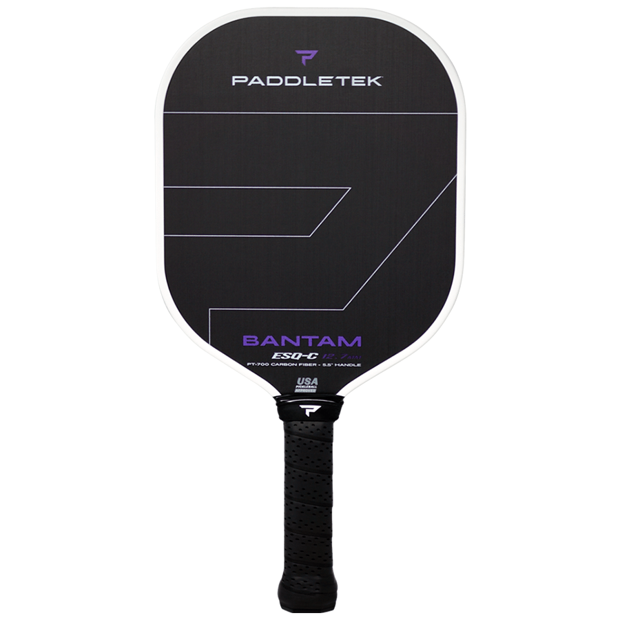 The Bantam ESQ-C was designed in collaboration with pickleball pro, Andrea Koop, to provide a combination of power, spin, and forgiveness. PT-700 unidirectional RAW carbon fiber is combined with our more forgiving 14.3mm Bantam core to give serious players controllable power and spin capability. A 5 1⁄2” handle reduces wind drag and allows for a two-handed backhand, while a large, consistent sweet spot adds finesse to every shot. DISCLAIMER: The Bantam ESQ-C (Esquire) will not be held liable for any distress incurred by your opponent. Court is in session.