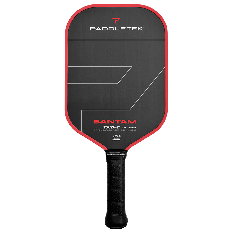 The Bantam TKO-C was designed in conjunction with top pickleball pro, Christian Alshon, to provide a combination of power, spin, and reach. PT-700 unidirectional RAW carbon fiber is combined with our more forgiving 14.3mm Bantam core to give serious players controllable power and max spin capability. A 16 1/2″ overall paddle length increases speed at the point of contact—exponentially increasing power with every hit.